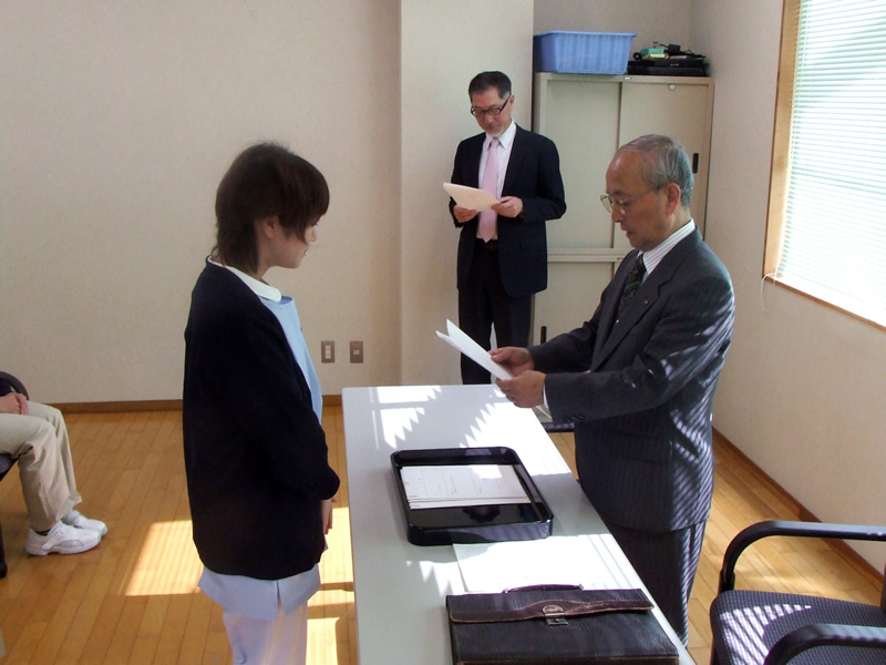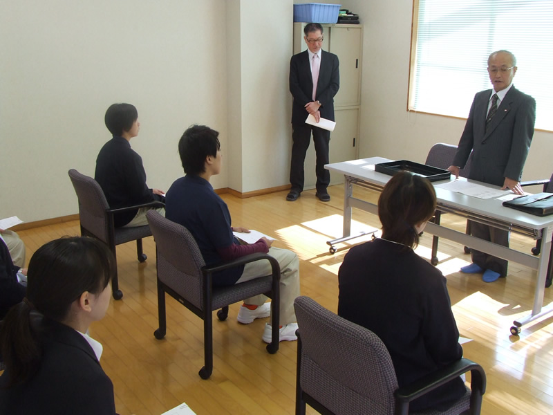 辞令交付式 2014年4月1日 今年度の新採用職員は看護師1名、介護職員2名です。他に昇進者1名、昇格者2名がおり、計6名で行われました。 田中理事長より一人一人に辞令が手渡された後、今後の活躍への期待について話がありました。 新採用職員の皆さん、今日から私たちの仲間入りです。うれしいことや大変なことなどたくさんあると思いますが、一緒になって頑張っていきましょう!昇進、昇格された皆さん、これからもより一層頑張ってくださいね。